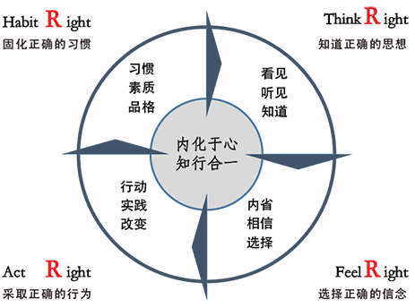 企業(yè)文化落地的過(guò)程是從“知的一致”到“行的一致”的過(guò)程,通過(guò)“知行合一”文化落地四階段——“知道正確的思想”,“選擇正確的信念”,“采取正確的行為”,“固化正確的習(xí)慣”,最終達(dá)到企業(yè)文化內(nèi)化于心,知行合一的落地目標(biāo)。