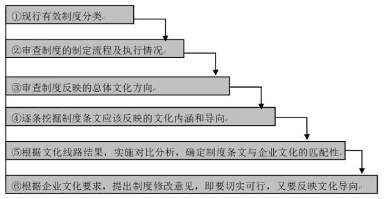 文化與制度匹配性的審查通常是制度匹配工作中最繁瑣的環(huán)節(jié),為了更好地理清頭緒,提高審查的效率和精確度,建議可以采用“制度”和“文化”雙線并進(jìn)的審查方法。“制度線路”重在審查管理制度是否符合企業(yè)文化理念的價值導(dǎo)向,“文化線路”重在審查企業(yè)文化核心理念、文化元素是否有管理制度作為支撐和保證。兩條線路中,“文化線路”先行,最終將兩條線路的分析結(jié)果匯總。