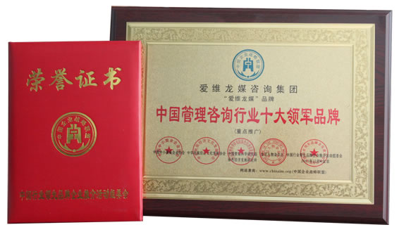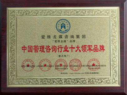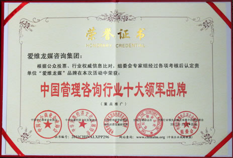 2011年12月,在第二屆“行業(yè)領先品牌暨創(chuàng)新標桿企業(yè)”評選活動中,根據(jù)公眾投票、行業(yè)權(quán)威信息比對和組委會專家組考核,愛維龍媒咨詢集團榮獲“中國管理咨詢行業(yè)十大領軍品牌”大獎。