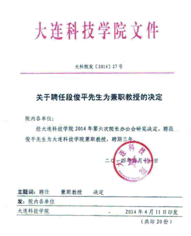 近日,段俊平董事長(zhǎng)被中國(guó)鐵建黨校、大連科技學(xué)院聘為客座教授。