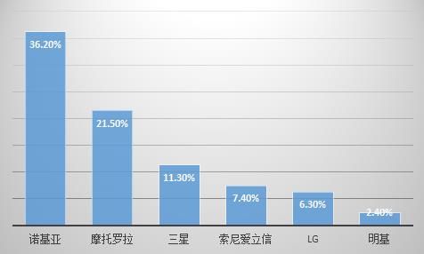 以手機(jī)行業(yè)為例,2007年諾基亞風(fēng)頭正勁,諾基亞等六大手機(jī)制造商占據(jù)了85%的市場(chǎng)份額,摩托羅拉出現(xiàn)較大幅度增長(zhǎng),而三星出現(xiàn)下滑。其中,諾基亞的全球市場(chǎng)份額36.2%,摩托羅拉的市場(chǎng)份額21.5%,三星的市場(chǎng)份額11.3%,索尼愛立信的市場(chǎng)份額7.4%,LG的市場(chǎng)份額為6.3%;明基的市場(chǎng)份額為2.4%。