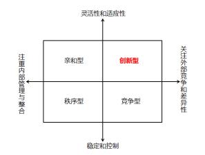 組織文化研究者通常對奎因模型都不會陌生。而基于奎因模型的“對立價值模型”,從企業(yè)靈活性與適應(yīng)性的強弱程度、企業(yè)管理內(nèi)部(或外部)側(cè)重程度這兩個最基本的維度,將企業(yè)組織大致分為這樣四種類型(如下圖所示)。文章篇幅所限,本文主要談創(chuàng)新型。所謂創(chuàng)新性的組織,往往相對更重視外部競爭和組織差異性,同時組織管理又比較靈活機動。而能夠具有上述特征的企業(yè),其企業(yè)文化一般具有創(chuàng)新型企業(yè)文化的特點。